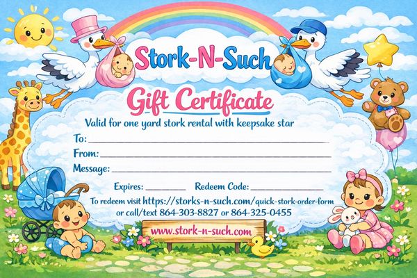 Our Stork-N-Such Gift Certificates are the perfect way to celebrate a new baby! Each certificate is valid for one yard stork rental with a keepsake star, creating a fun and memorable welcome home for new parents.